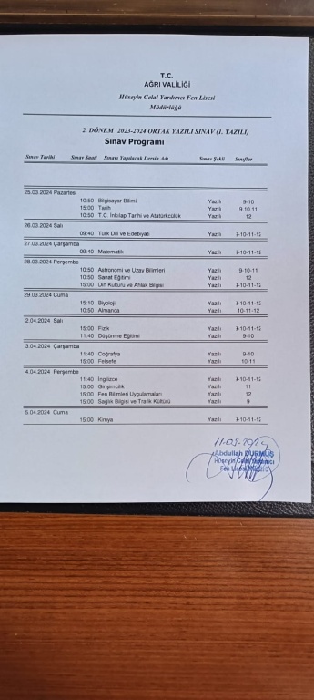2023-24 Eğitim-Öğretim Yılı 2.Dönem 1.Yazılı Sınav Takvimi